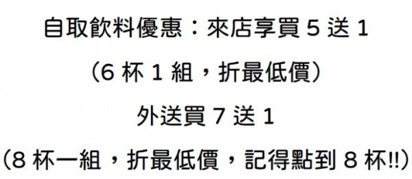 自取飲料優惠:自取9折優惠 或 來店享買5送1 (6杯1組,折最低價) 系統自動運算最優惠價 外送優惠:買7送1 (8杯一組,折最低價,記得點到8杯!!)